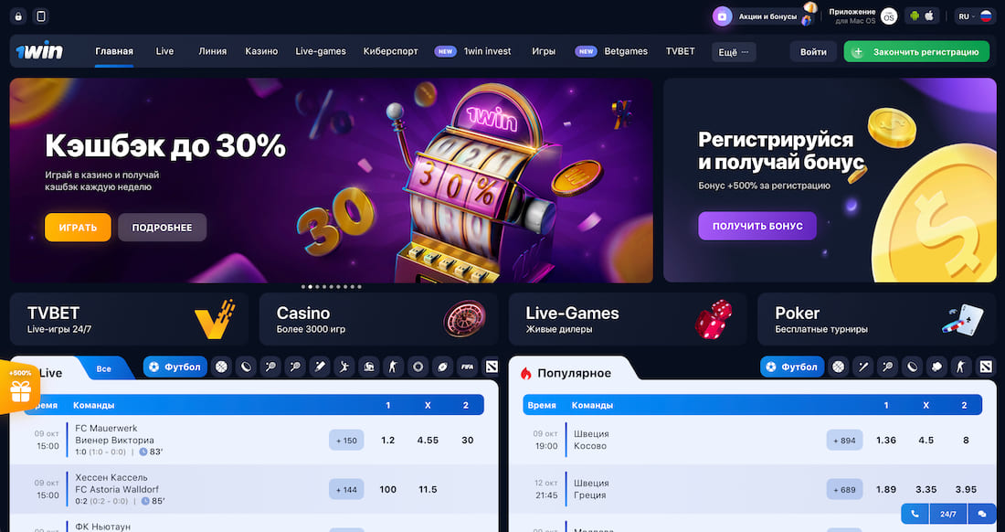 1Вин — это относительно молодая букмекерская компания, основанная в 2017 году. Она быстро завоевала популярность среди игроков, особенно в странах СНГ, благодаря щедрым бонусам, широкой линии ставок, конкурентным коэффициентам и удобному сайту.